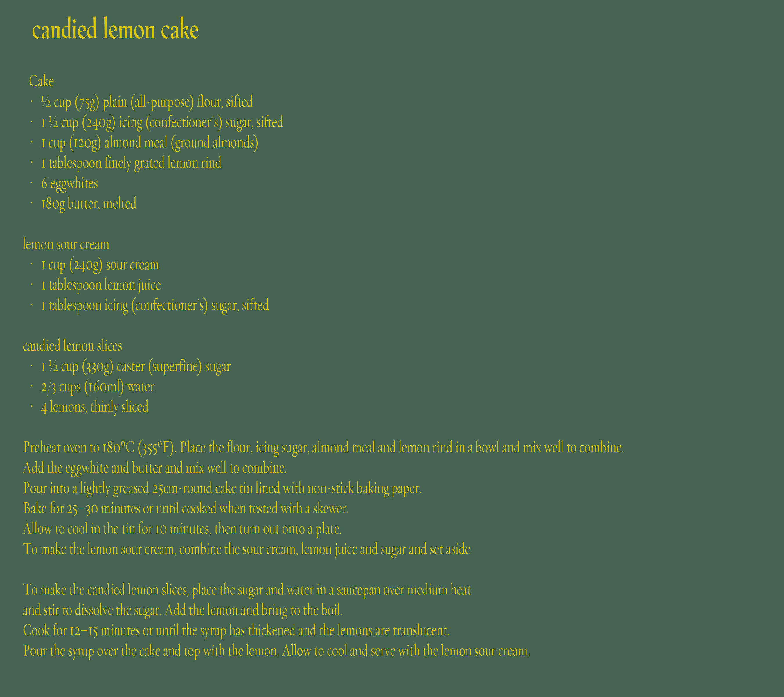 Candied Lemon Cake Posted on August 3, 2011 by photoappetite If you love lemon, this cake is gonna be your new favorite. Biting into the slices of whole candied lemon rinds and all, is a sweet and tangy sensation. This cake makes a beautiful presentation. Certainly the center piece of the table. Share this:Tweet Click to email a link to a friend (Opens in new window) Email Like Loading... Related