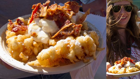 The classic Funnel Cake taken to a whole new level. Powdered sugar, a dollop of whipped cream and a pile of bacon. Sweet and salty never taste so good.