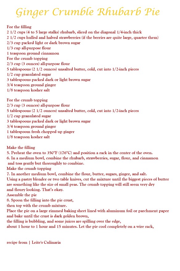 The rhubarb patch in the garden is ready for harvest and one of my favorite things to make is pie.  This recipe is sweet and tart, what I like is there is only natural sugar in the pie. It’s made with maple syrup, lemon and ginger.  Very simple ingredients and easy to make. Unknown-1Unknownrhubarcrust_MG_3490